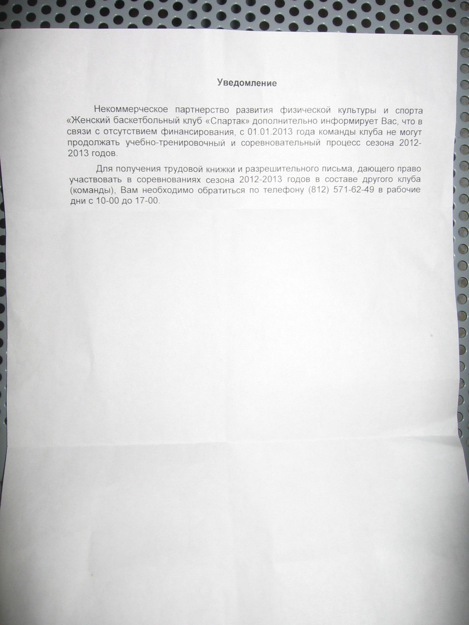 и еще один пост из ВК группы: Многие думают, что я, Николай Дерягин, бывший пресс-атташе клуба, пиарюсь в этой группе или веду себя, как обиженный мальчик, у которого отобрали любимую игрушку… Попробую объяснить, для чего мне это всё нужно! Здесь уже писалось, что о своих финансовых проблемах руководство Женского баскетбольного клуба «Спартак» заявило в январе 2012 года. В итоге без заработной платы игроки, тренеры и работники клуба находились 9 месяцев. Причём у многих игроков закончились контракты и они заключили новые с другими клубами, а вот окончательный расчёт с ними руководство «Спартака» так и не произвело. Долги по зарплате начали выплачивать в августе, причём не всё сразу, а частями. В итоге мне лично потребовалось немало усилий, чтобы разобраться – клуб не заплатил мне (и не только мне) за два месяца работы. Выяснилось, что не перечислена зарплата за ноябрь-декабрь 2011 года. Тогда же в августе среди работников клуба стали ходить разговоры, что финансирование «Спартака» с большой долей вероятности прекратится 31 декабря 2012 года. Я тогда ещё подумал, интересно, а новых игроков, с которыми подписываются контракты, предупреждают об этом? Но тогда, видимо, об этом никто не думал – обе команды (основная и ДЮБЛ) были отправлены на продолжительные учебно-тренировочные сборы и у всех складывалось впечатление, что у «Спартака» всё хорошо. Ещё больше это предположение укрепила победа в Кубке Кузина. Дебютный сезон в Суперлиге начал складываться успешно и у многих зародилась надежда, что клуб по спортивному принципу уже в следующем сезоне вернётся в элитный дивизион страны. Однако, за всеми этими победами и успехами, скрывались куда большие проблемы и задача на новый сезон из «выйти в Премьер-лигу» превратиться в «ВЫЖИТЬ...»! Вы не задумывались почему, например, в этом сезоне обошлись без традиционной презентации команды? Потому что она, по мнению руководства клуба, никому не нужна. Как и не нужны афиши и программки к домашним матчам – в их финансировании тоже было отказано. Поверьте, это не такие уж большие деньги, но г-н Крюков посчитал, что зрители обойдутся без программок и афиш. К слову, в этом сезоне директор клуба не был НИ НА ОДНОМ МАТЧЕ своей команды. Более того, насколько мне известно, до начала декабря этого года г-н Крюков так и не встретился с главным тренером «основы» Андреем Владимировичем Долопчи – его назначение на этот высокий пост состоялось по телефону, а главный тренер даже понятия не имеет, как выглядит директор клуба. Думаю, этот факт о многом говорит! Но, несмотря на безразличие руководства клуба, обе команды (основная и ДЮБЛ) показывали и показывают достаточно высокие результаты! С каждым днём я всё больше и больше убеждался, что женский «Спартак» медленно, но верно погибает… В конце ноября мне стало известно, что в клубе прошла аудиторская проверка, выявившая многомиллионные долги, а руководство клуба в полном составе - директор и два бухгалтера - написали заявления об увольнении по собственному желанию! В том, что «Спартак» идёт ко дну, уже никаких сомнений не было, а кто первым бежит с тонущего корабля? Правильно - КРЫСЫ! Последней каплей моего терпения стал переезд клуба из просторного офиса на «Техноложке» в маленькую комнатку в СДЮСШОР «Купчинский Олимп», а это очередное подтверждение тому, что 31 декабря 2012 год